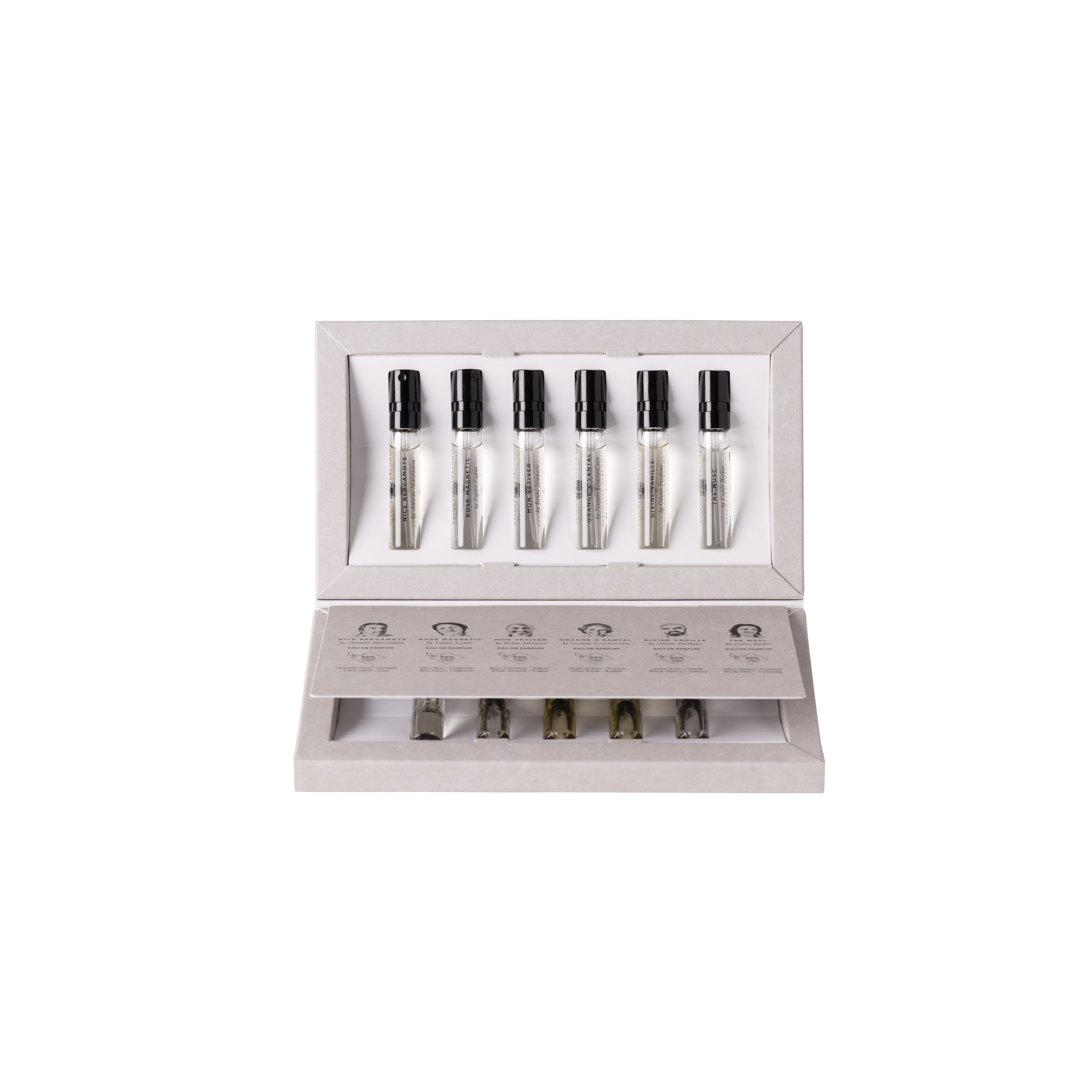 Divine Vanille By Olivier Pescheux: Alcohol Denat., Parfum (Fragrance), Aqua (Water), Ethylhexyl Methoxycinnamate, Coumarin, Butyl Methoxydibenzoylmethane, Ethylhexyl Salicylate, Benzoic Acid, Limonene, Linalool, Pentaerythrityl Tetra-Di-T-Butyl Hydroxyhydrocinnamate, Benzyl Benzoate, Geraniol, Cinnamal, Bht, Mon Vetiver: Alcohol Denat., Parfum (Fragrance), Aqua (Water), Limonene, Ethylhexyl Methoxycinnamate, Linalool, Butyl Methoxydibenzoylmethane, Ethylhexyl Salicylate, Bht, Coumarin, Citronellol, Alpha-Isomethyl Ionone, Citral, Benzyl Benzoate, Eugenol, Geraniol, Isoeugenol, Nice Bergamotte: Alcohol Denat., Parfum (Fragrance), Aqua (Water), Limonene, Linalool, Ethylhexyl Methoxycinnamate, Hexyl Cinnamal, Butyl Methoxydibenzoylmethane, Ethylhexyl Salicylate, Bht, Citral, Geraniol, Coumarin, Pentaerythrityl Tetra-Di-T-Butyl Hydroxyhydrocinnamate, Citronellol, Methyl Benzoate, Benzyl Benzoate, Cinnamal, Eugenol, Orange X Santal: Alcohol Denat., Parfum (Fragrance), Aqua (Water), Limonene, Ethylhexyl Methoxycinnamate, Butyl Methoxydibenzoylmethane, Ethylhexyl Salicylate, Linalool, Geraniol, Coumarin, Evernia Prunastri (Oakmoss) Extract, Citral, Citronellol, Eugenol, Bht, Rose Magnetic: Alcohol Denat., Parfum (Fragrance), Aqua (Water), Ethylhexyl Methoxycinnamate, Limonene, Butyl Methoxydibenzoylmethane, Ethylhexyl Salicylate, Linalool, Geraniol, Bht, Citronellol, Coumarin, Citral, Eugenol, The Musc: Alcohol Denat., Parfum (Fragrance), Aqua (Water), Ethylhexyl Methoxycinnamate, Alpha-Isomethyl Ionone, Butyl Methoxydibenzoylmethane, Ethylhexyl Salicylate, Citronellol, Linalool, Citral, Benzoic Acid, Benzyl Benzoate, Bht, Bois Imperial: Alcohol Denat., Parfum (Fragrance), Aqua (Water), Alpha-Isomethyl Ionone, Linalool, Ethylhexyl Methoxycinnamate, Eugenol, Butyl Methoxydibenzoylmethane, Ethylhexyl Salicylate, Limonene, Bht, Fig Infusion: Alcohol Denat., Parfum (Fragrance), Aqua (Water), Linalool, Limonene, Ethylhexyl Methoxycinnamate, Coumarin, Butyl Methoxydibenzoylmethane, Ethylhexyl Salicylate, Citral, Benzyl, Patchouli Mania: Alcohol Denat., Parfum (Fragrance), Aqua (Water), Linalool, Butyl Methoxydibenzoylmethane, Coumarin, Benzyl Benzoate, Benzyl Cinnamate, Tocopherol, Eugenol, Limonene, Geraniol, Farnesol, Benzyl Alcohol, Neroli Botanica By Anne Flipo: Alcohol Denat., Parfum (Fragrance), Aqua (Water), Limonene, Linalool, Ethylhexyl Methoxycinnamate, Hexyl Cinnamal, Butyl Methoxydibenzoylmethane, Ethylhexyl Salicylate, Bht, Citral, Geraniol, Coumarin, Pentaerythrityl Tetra-Di-T-Butyl Hydroxyhydrocinnamate, Citronellol, Methyl Benzoate, Benzyl Benzoate, Cinnamal, Eugenol.